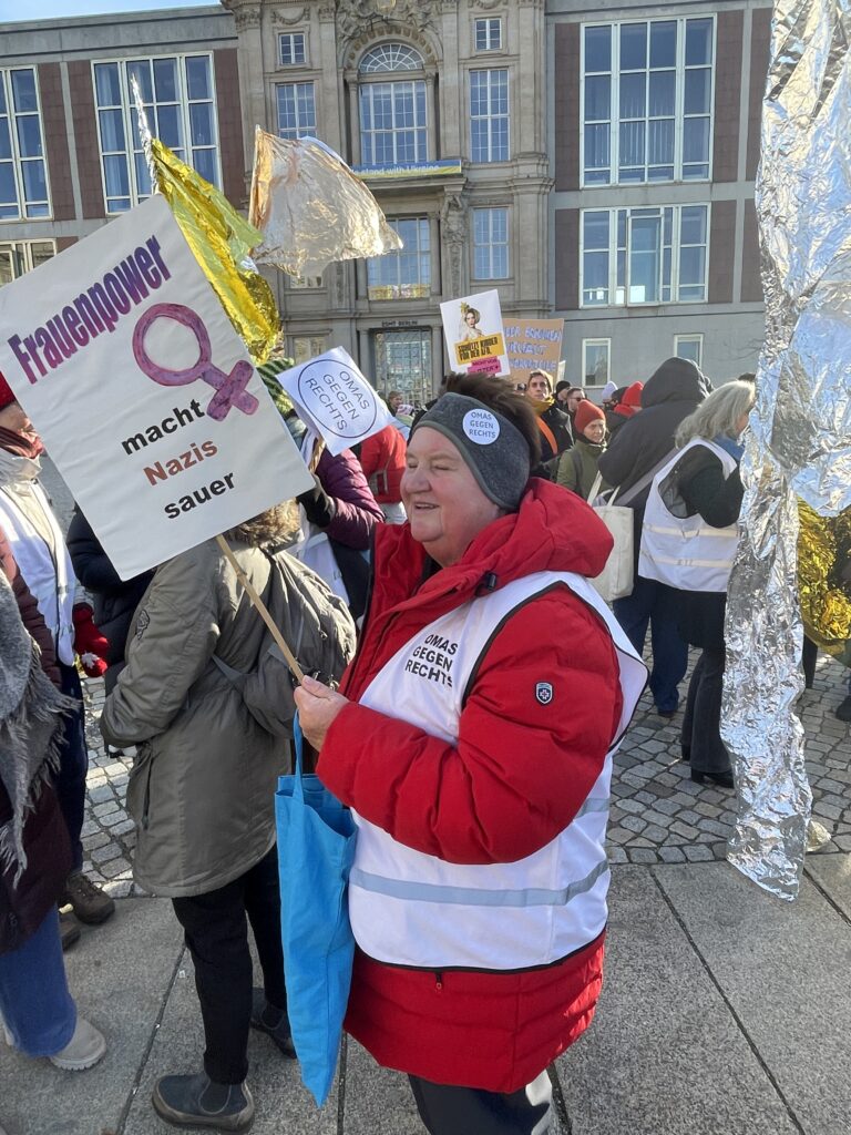 Seit 2018 gehen wir OMAS GEGEN RECHTS, wie viele andere zivilgesellschaftliche Initiativen, regelmäßig auf die Straße. Wir tun dies, um unsere Demokratie und die demokratischen Parteien dieses Landes gegen das Erstarken der AfD zu verteidigen – einer Partei, die vom Verfassungsschutz in weiten Teilen als gesichert rechtsextrem eingestuft wird.