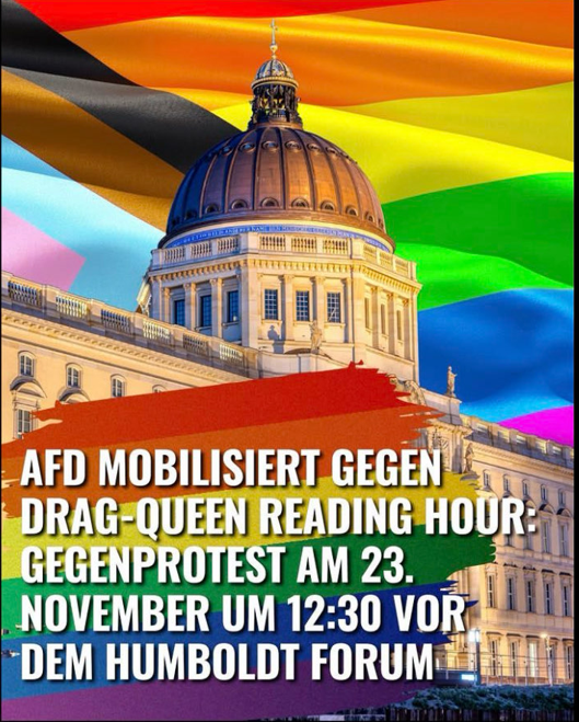 Wenn Rechtsextreme gegen eine Bilderbuchlesung für Kinder und Familien demonstrieren, weil sie zu viel Glitzer, zu viel Fantasie und 2 Drag-Queens fürchten, dann stehen wir gemeinsam mit anderen demokratischen Kräften gegen deren Einfalt und demonstrieren für Vielfalt und für Toleranz.