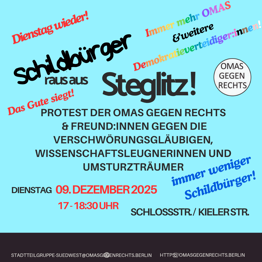 OMAS GEGEN RECHTS & friends protestieren gegen Verschwörungsglauben, Wissenschaftsleugnung und Umsturzpläne der Schilderleute auf dem Mittelstreifen. Treffpunkt: Ecke Schloßstraße/Kieler Str.