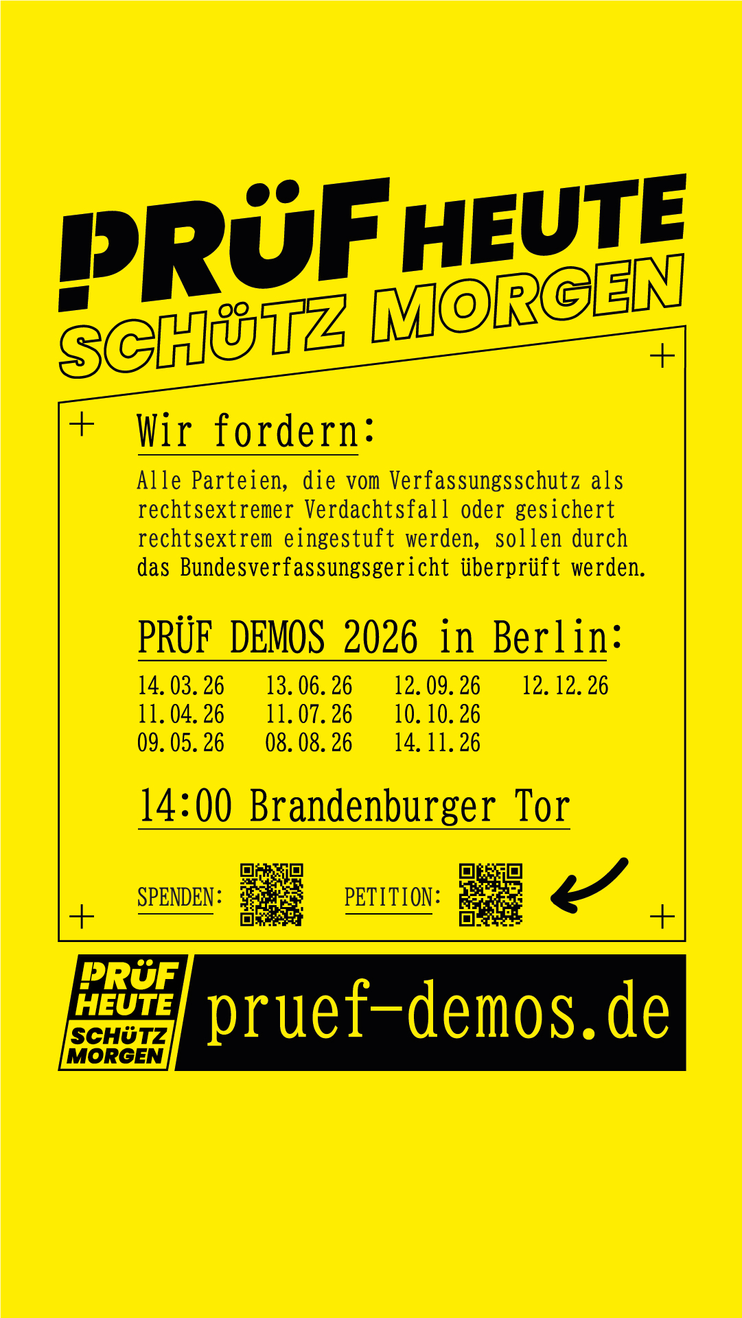 Pariser Platz Eine politische Kulturveranstaltung mit vielen bekannten Künstler*innen. Der Berliner Senat wird aufgefordert, sich beim Bundesrat für ein Prüfverfahren beim Bundesverfassungsgericht einzusetzen:„Alle Parteien, die vom Verfassungsschutz als rechtsextremer Verdachtsfall […]